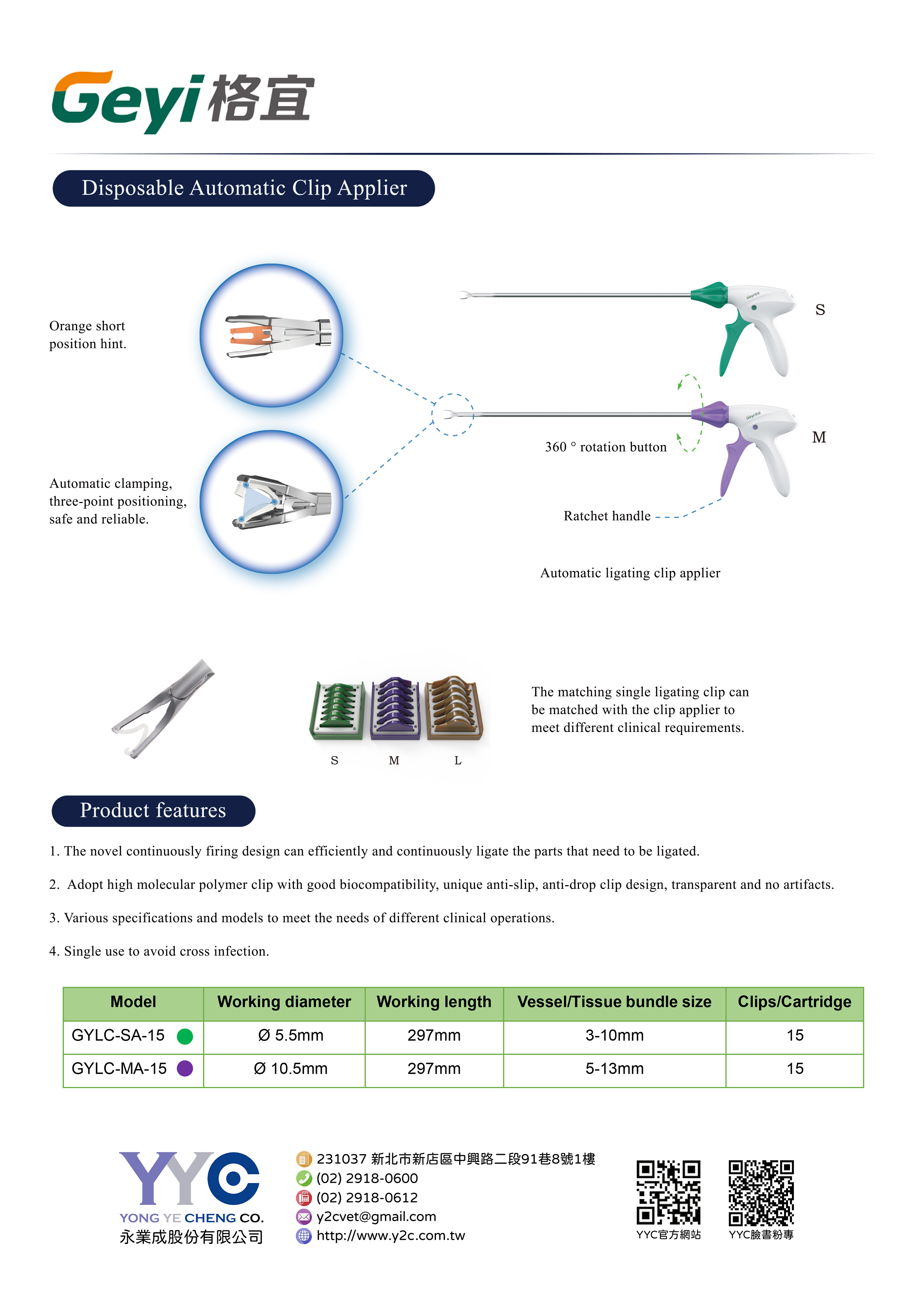 Geyi自動連發式高分子聚合物血管夾(Automatic Polymer Clip Applier)結合了「自動連發機構」的便利性與「高分子聚合物」的材質優勢,是現代微創手術(如胸腹腔鏡手術)中取代傳統鈦金屬夾的高階選擇。